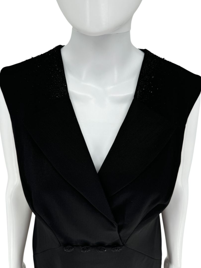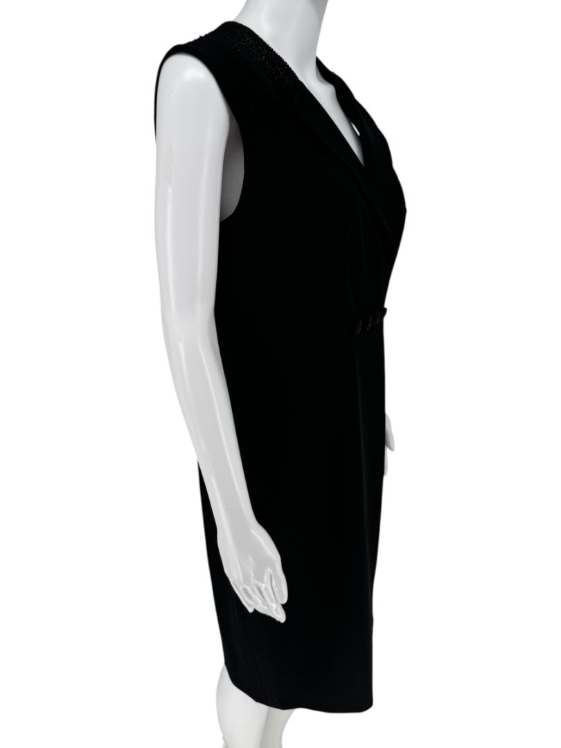 Make a confident and sophisticated entrance in this sculptural sheath dress by Pamella Roland, impeccably tailored with a structured silhouette and elegant details. The sleeveless design features a sharp notched lapel and a fitted waistline adorned with five tonal beaded buttons for a tailored, tuxedo-inspired finish.