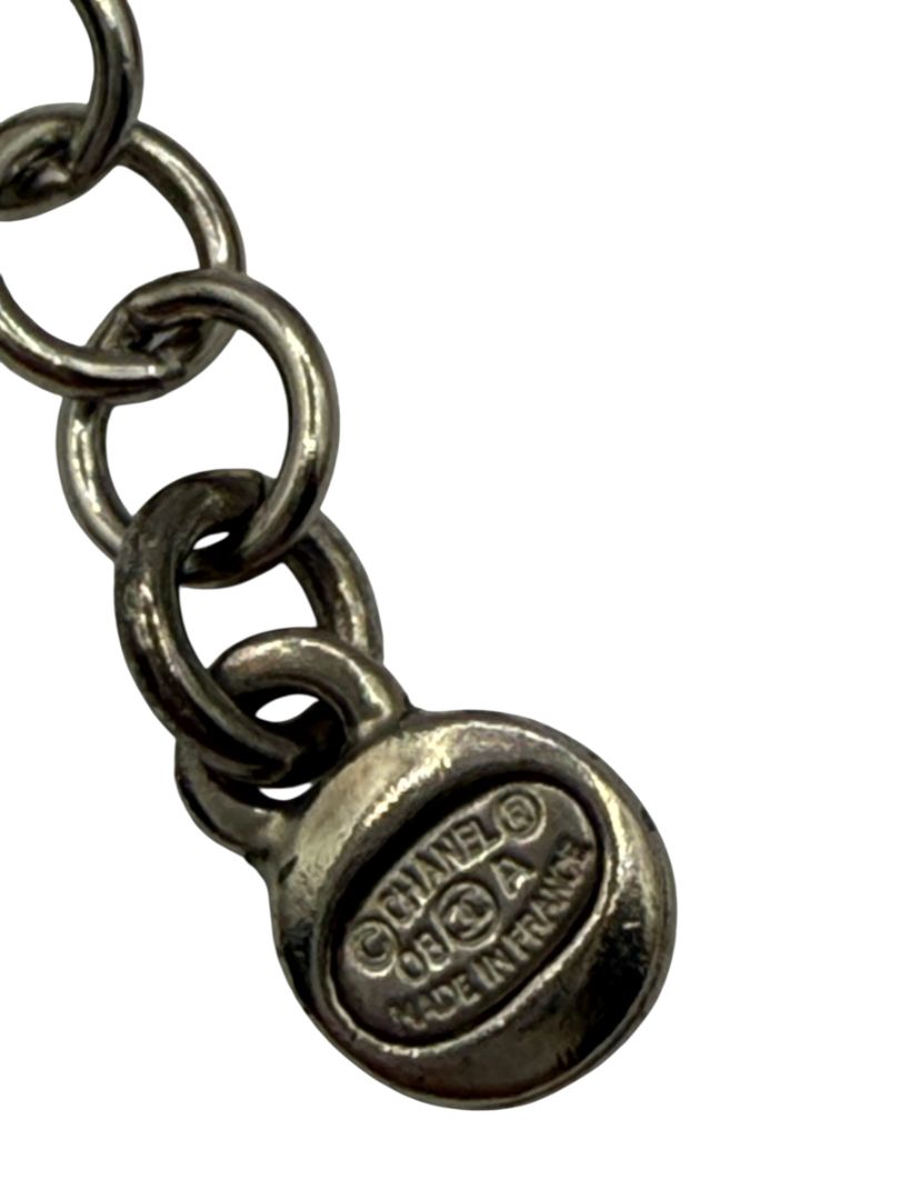 This show-stopping long necklace from Chanel’s 2008 collection is a gleaming tribute to two of fashion’s most iconic cities. Crafted in France from silvertone metal and studded with brilliant Swarovski crystals, it layers multiple delicate chains for a rich, draped effect. The design highlights sparkling crystal-set “PARIS” letters finished with an Eiffel Tower charm and “LONDON” letters topped with a regal crown motif, anchored by a bold interlocking CC charm.