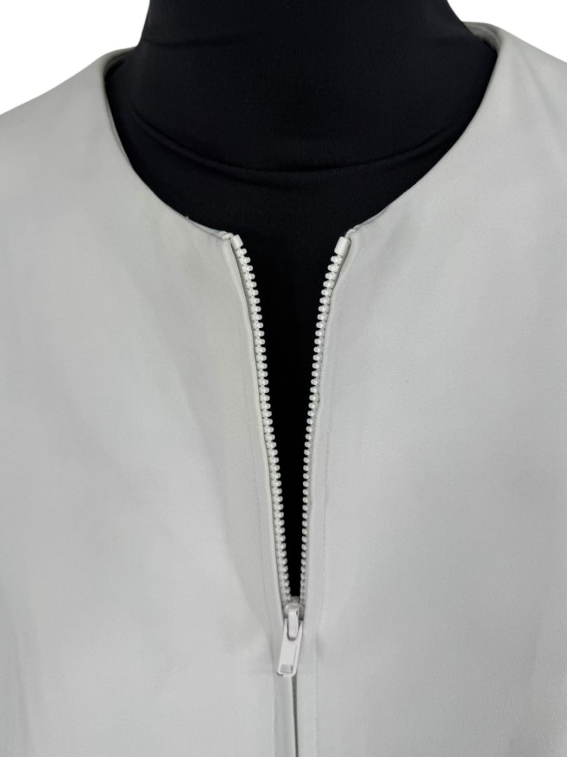 This timeless two-piece suit blends understated elegance with sharp tailoring. Crafted in the USA from a comfortable 90% polyester / 10% elastane blend, it offers a soft drape and subtle stretch. The jacket features a clean collarless neckline, full front zip closure, and discreet zip pockets at the waist for a modern, minimalist silhouette. Light shoulder structure adds polish without stiffness. The matching straight-leg trousers feature a flat front and rear welt pocket, creating a balanced, elongated line.