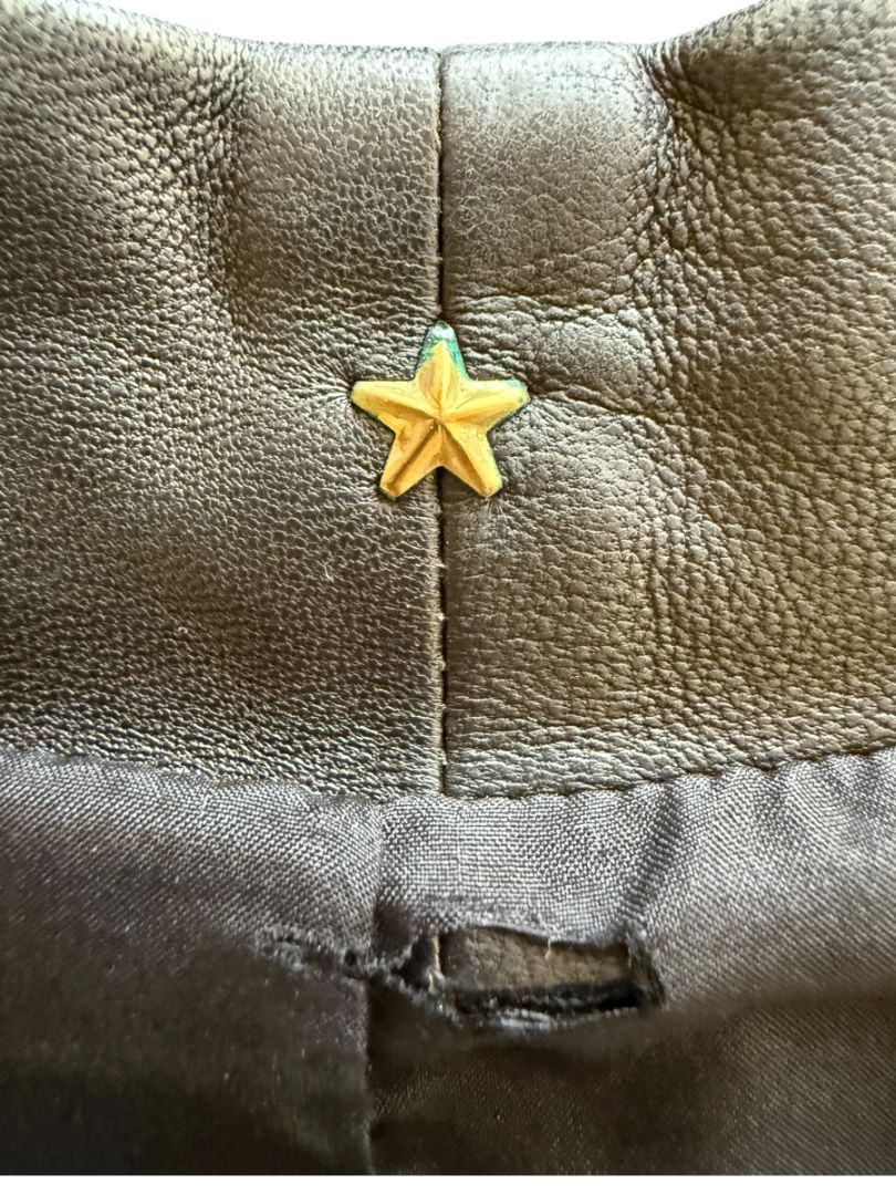 The jacket features wide, sculptural lapels that fold naturally, enhancing the organic flow of the leather. Subtle welt pockets and a simple open-front design keep the emphasis on form and material. The sleeves can be worn straight or lightly cuffed to showcase the interior texture, adding versatility and personality to the style. A small gold star detail inside the lining offers a refined artisanal touch.