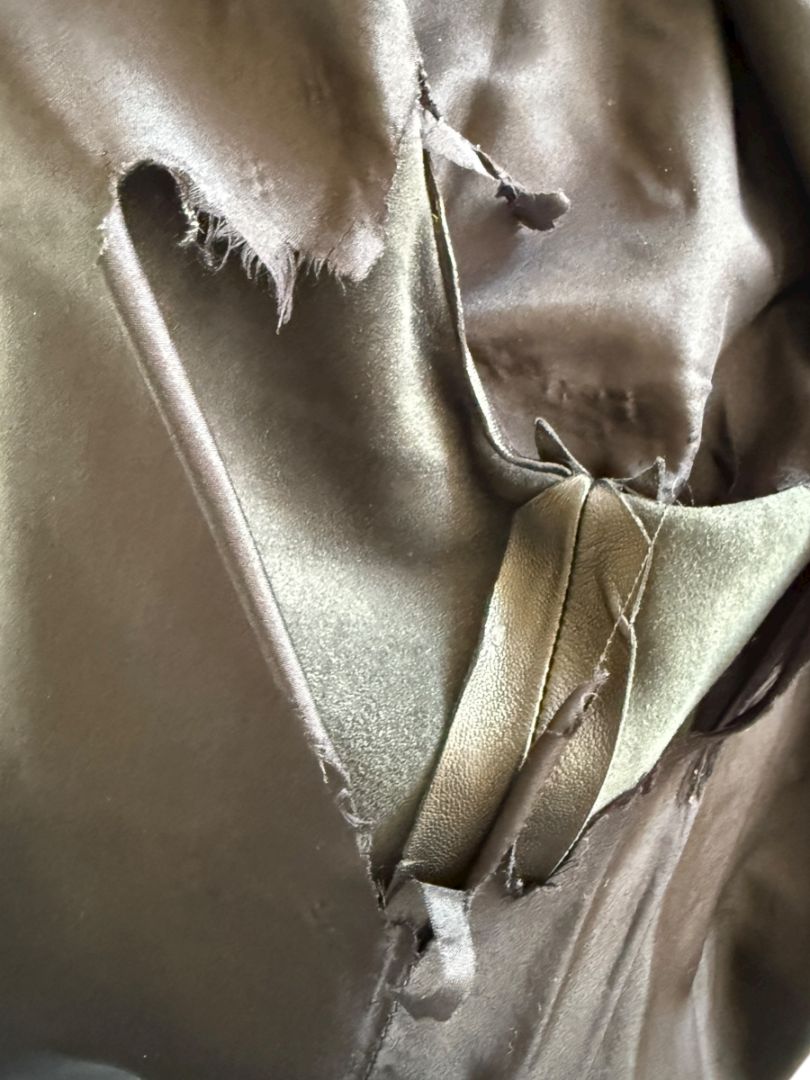 While unmistakably luxurious, the jacket shows significant wear to the interior lining, including tearing and fraying throughout, and would benefit from repair or replacement to fully restore its original comfort and longevity. The exterior leather, however, remains soft, smooth, and in good condition overall, retaining its rich texture and beautiful drape.
