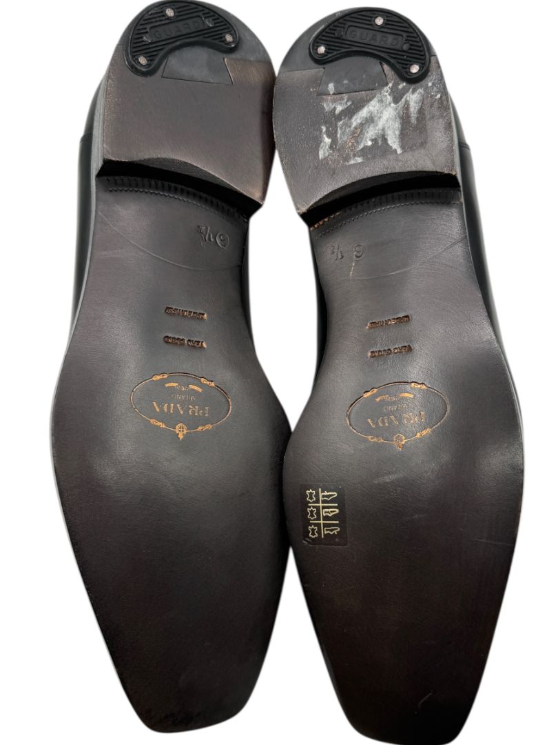 The shoes feature a clean, closed-lacing design, smooth leather uppers, and leather soles stamped with Prada’s classic gold branding. The squared toe shape adds contemporary elegance, making them an excellent choice for business, evening wear, or any polished occasion.
