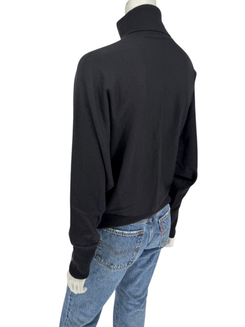 The sweater features a classic fold-over turtleneck, long sleeves, and a ribbed hem and cuffs for a flattering, gently fitted silhouette. Its relaxed yet polished shape makes it an ideal layering piece, perfect for both casual sophistication and professional ensembles. The deep black hue enhances its versatility, pairing effortlessly with denim, tailored trousers, or skirts.