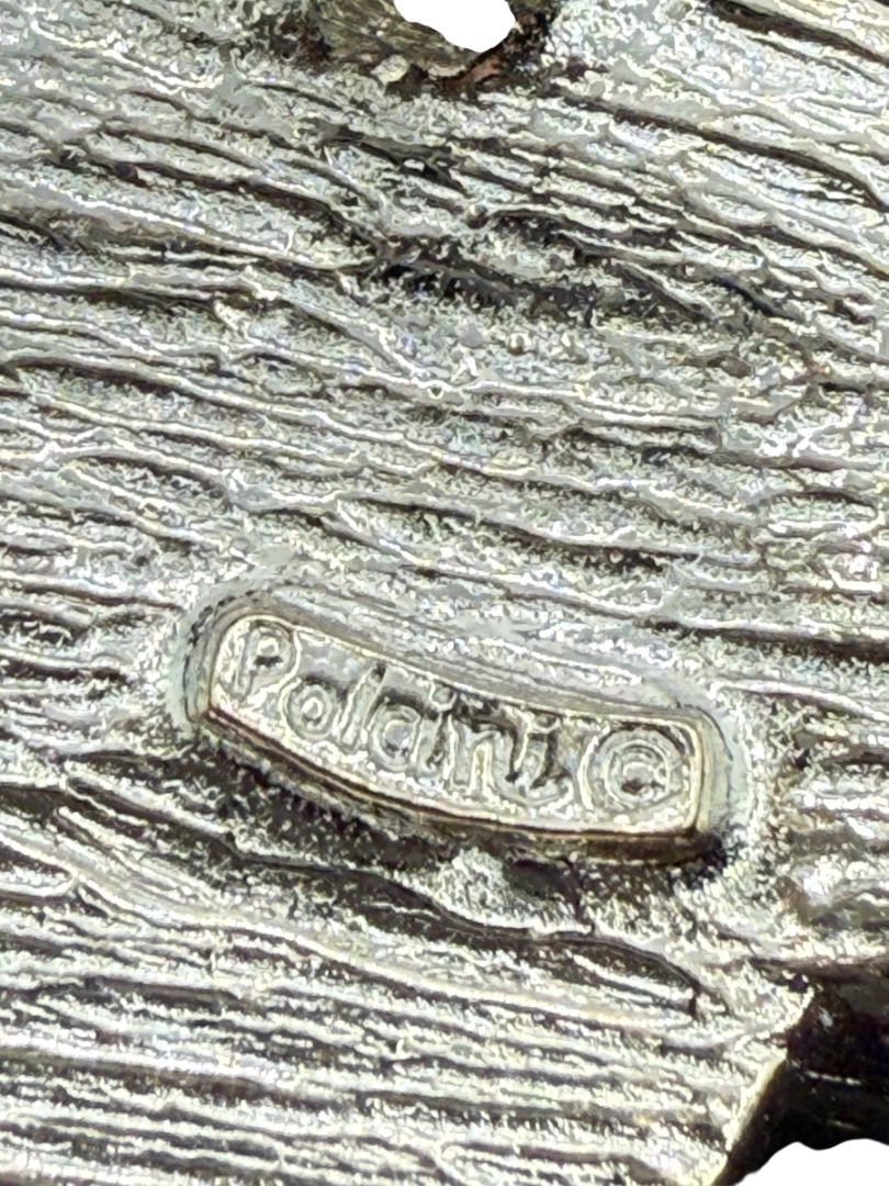 This dazzling vintage-style brooch by Polani features an Art Deco–inspired automobile rendered entirely in shimmering clear rhinestones. A stylishly dressed woman stands beside the car, adding charm, character, and a touch of 1920s glamour to the piece. The brooch is beautifully detailed, with pavé rhinestones covering the wheels, body, and door panels for maximum sparkle. Crafted in a silver-tone metal and stamped Polani on the reverse, it’s a collectible accessory perfect for vintage lovers, jewelry collectors, or anyone wanting a standout statement piece.