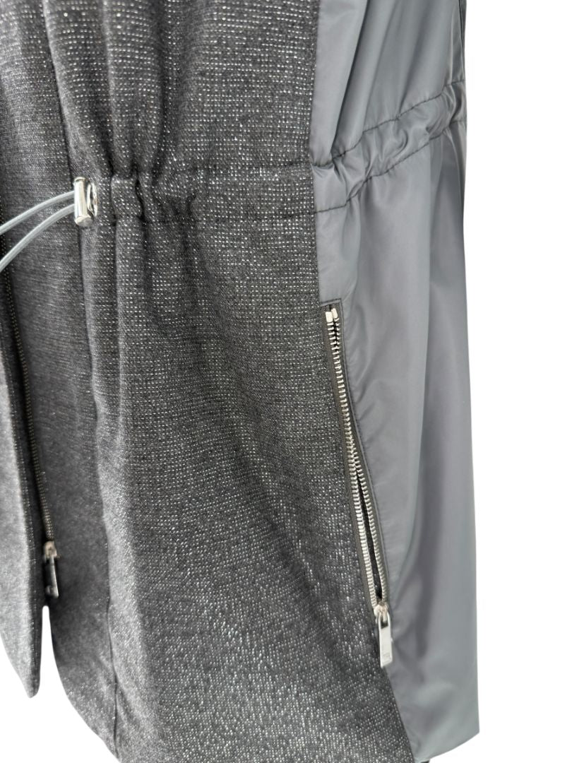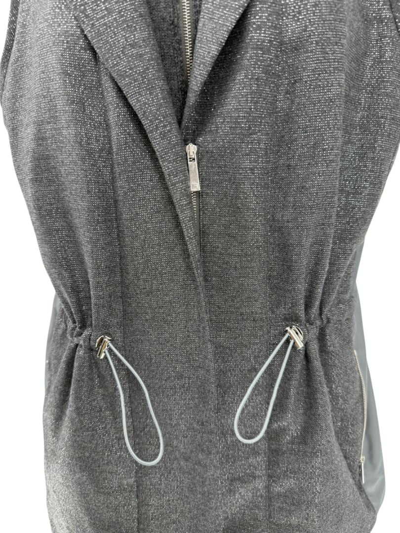 Elevate off-duty layers with this versatile Lafayette 148 New York hooded vest. Expertly tailored from stretch wool fabric made in Italy by Ing. Loro Piana & C., it showcases a sophisticated charcoal grey front with subtle metallic threading for a hint of sheen. The vest is designed with an adjustable drawstring waist for a defined silhouette and features a soft knit hood for relaxed ease. A full zip closure and zippered pockets add functionality to the urban-luxe design.