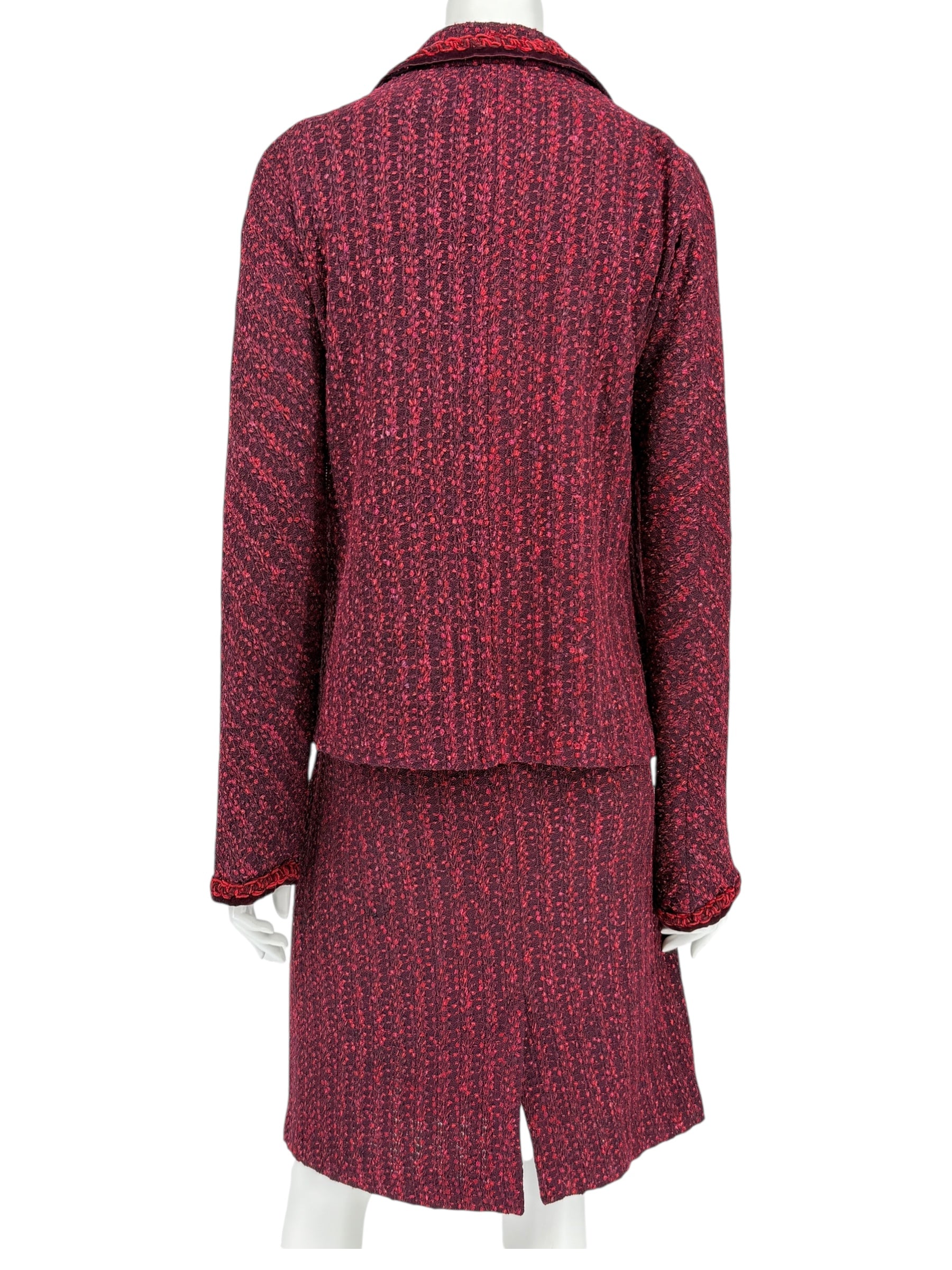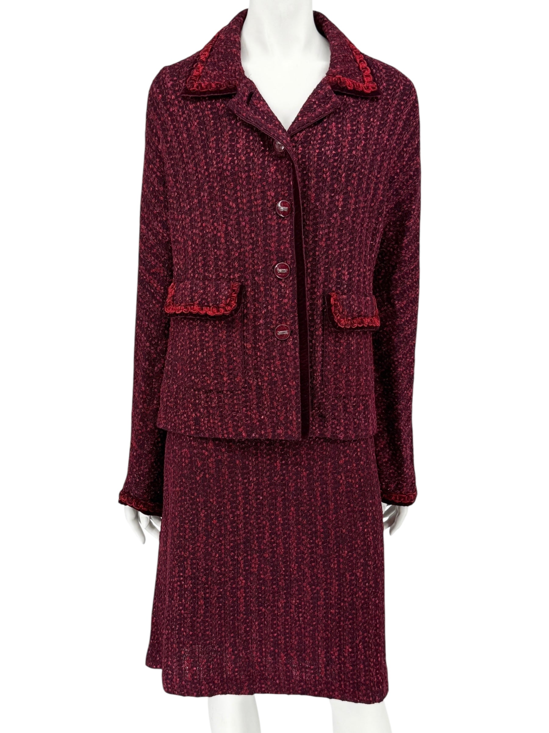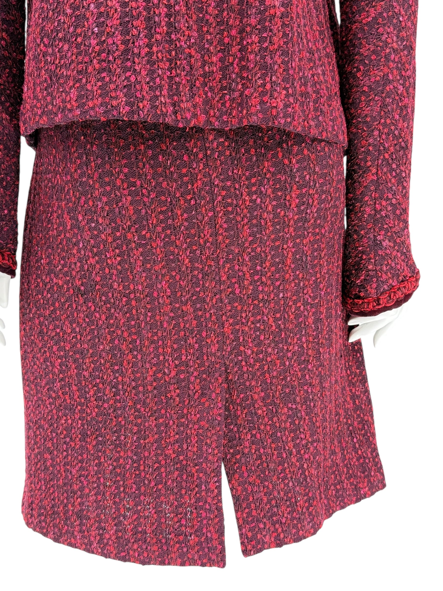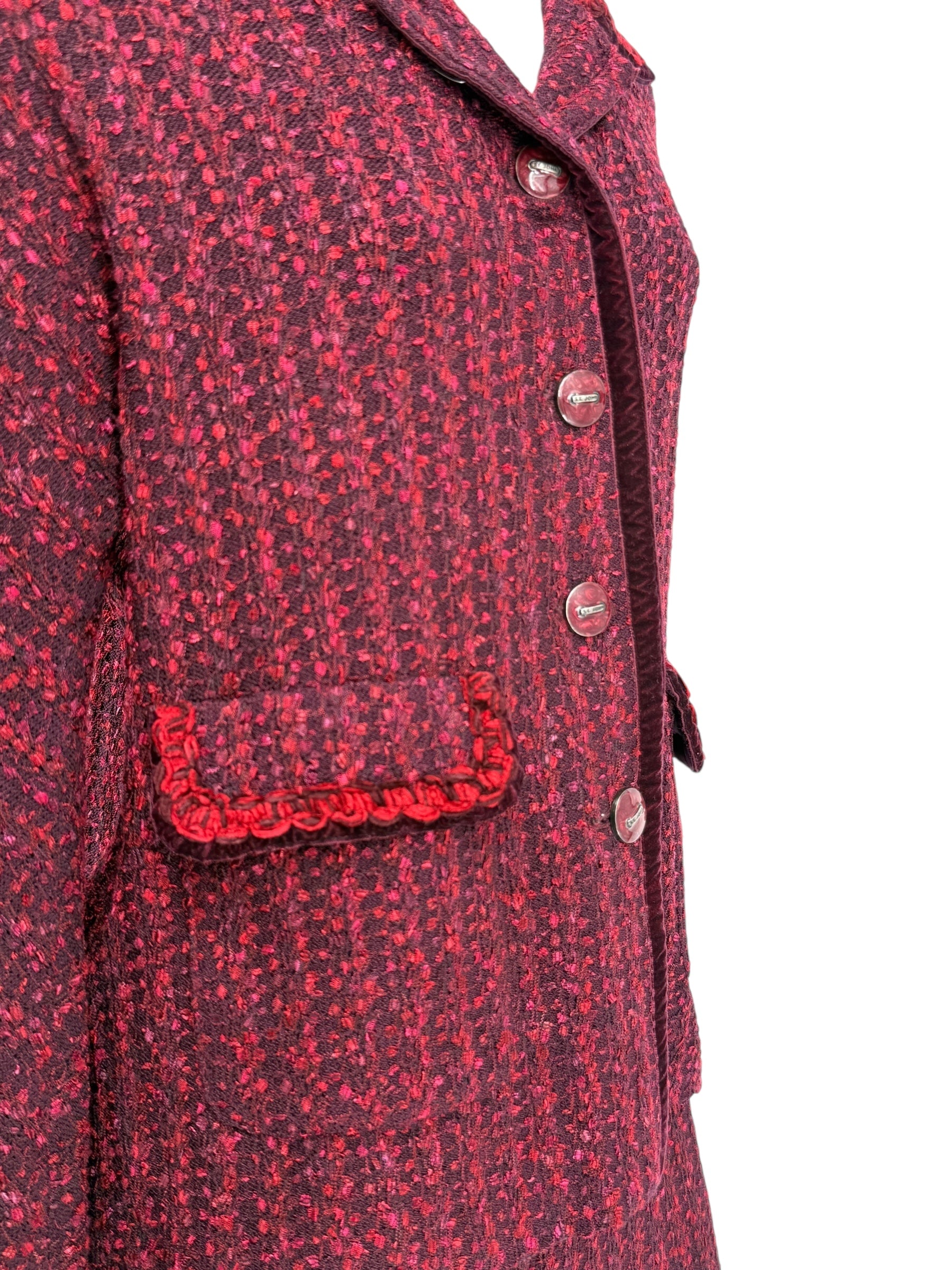 This timeless St. John Collection skirt suit is crafted in a richly textured knit, blending deep burgundy with vibrant red accents for a refined yet statement-making look. The jacket features a tailored silhouette with velvet trim, braided detailing along the collar and pockets, and signature St. John buttons for a polished finish. The matching straight skirt is designed with an elastic waistband for comfort and a back slit for ease of movement, creating a flattering and elegant ensemble suitable for both professional and social settings.