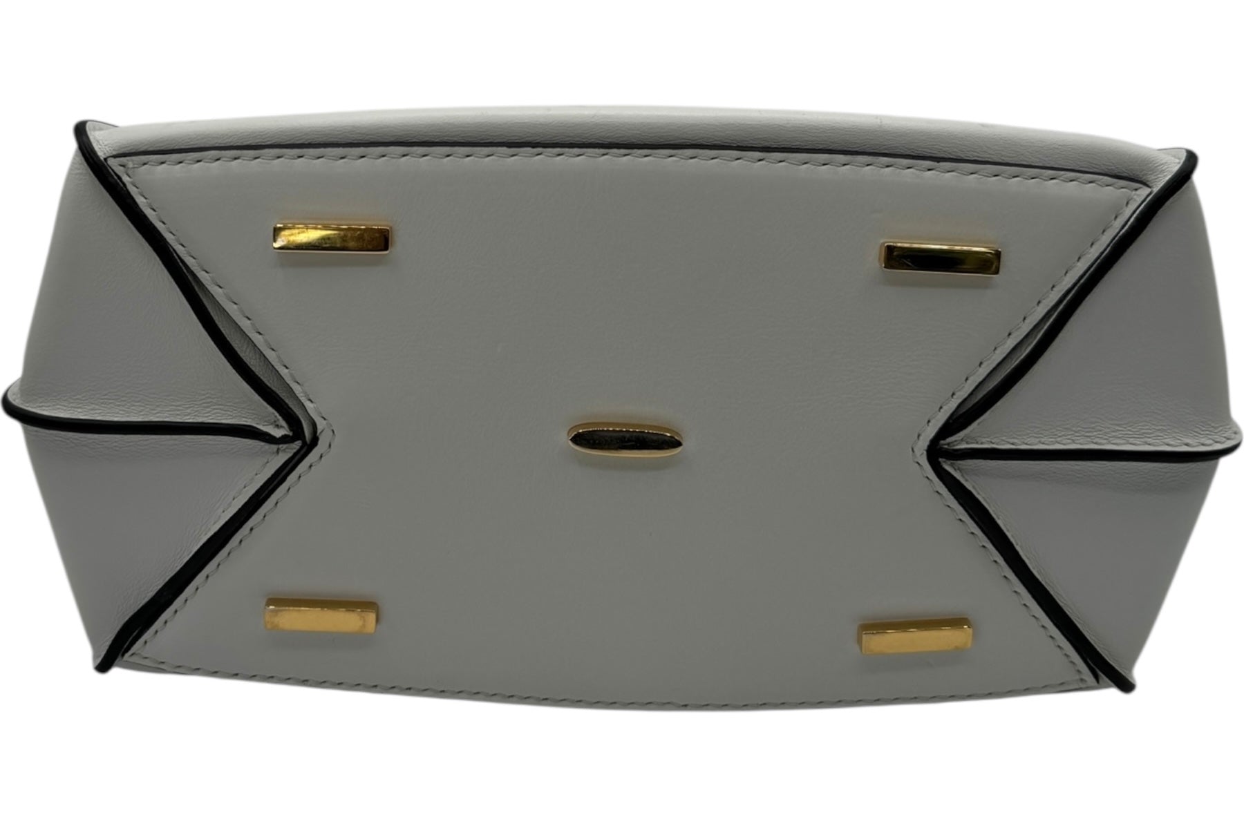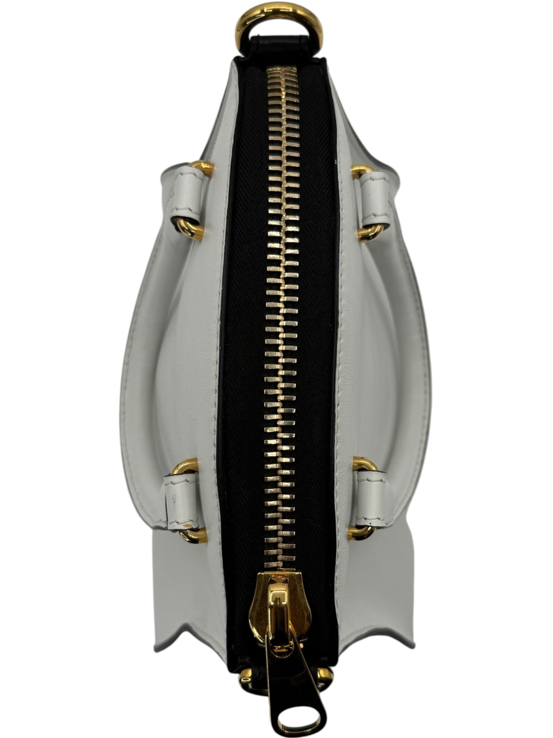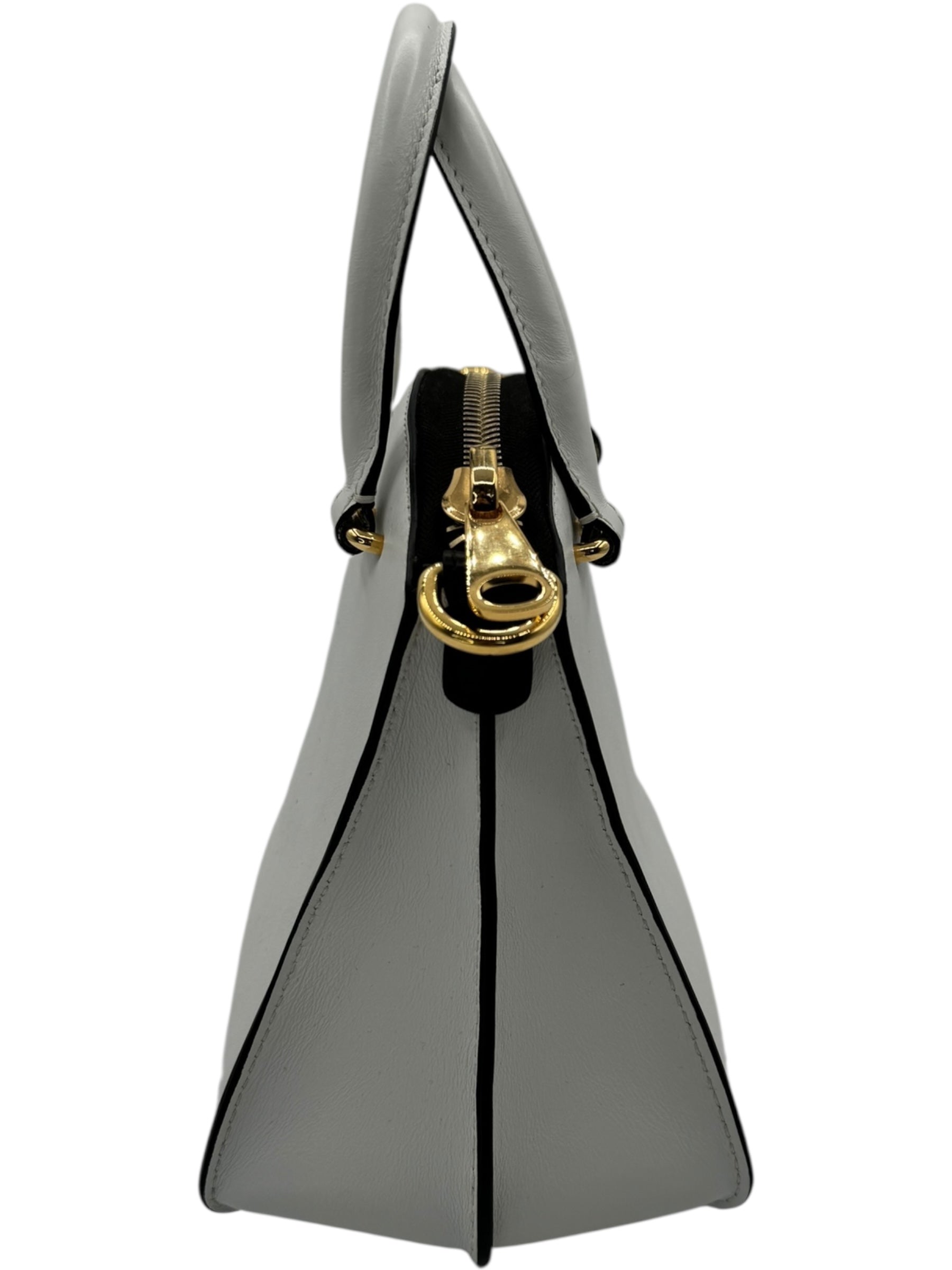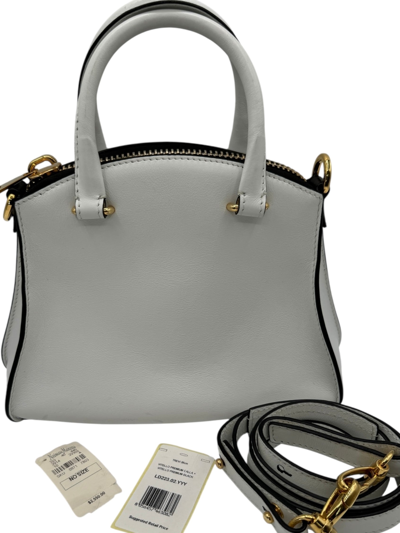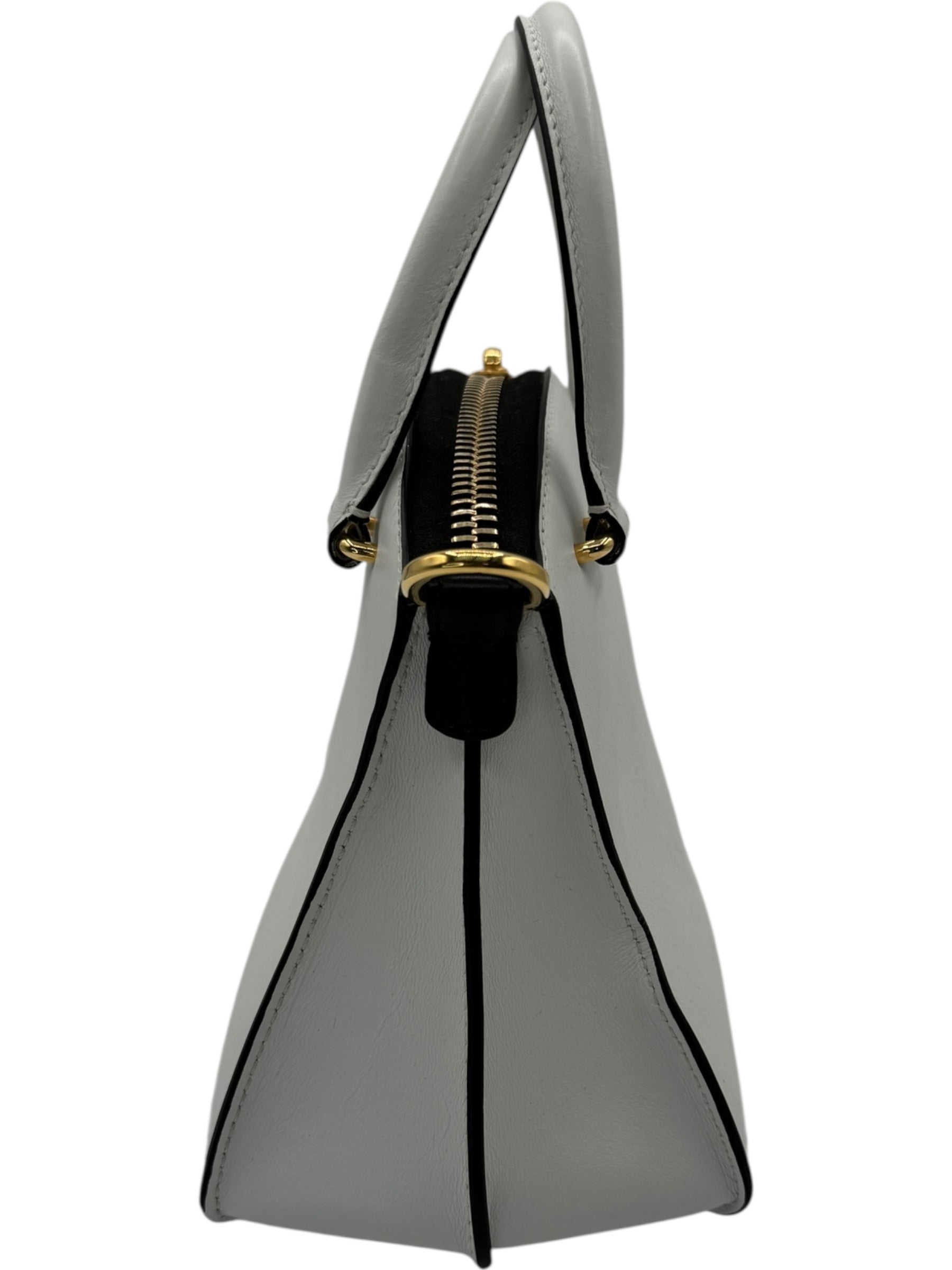 House of Italian leather. First Edition , hand made in Italy. Mini calfskin satchel bag white/black . Smooth calfskin with contrasting edges, golden hardware, tonal topstitching rolled double tote, handles with rings, detachable adjustable shoulder strap. Edition Number 136 of 300. Perfect condition outside and inside the only signs of wear is light creasing to interior pocket. Inside there is also an additional zippered compartment. Retail: $2500